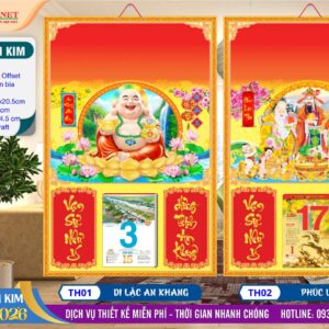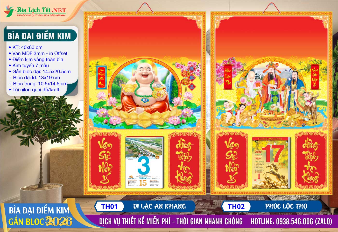 Lịch tết sài gòn cung cấp Bìa Đại (40x60cm) Điểm Kim – Di Lặc An Khang gắn bloc 2026, LH: 0938 546 006 (zalo/viber), Đc:72 Lê Hồng Phong, P.2, Q.5, TP.HCM. Bìa ván MDF ép kim 40×60, sắc sảo, tinh tế, in theo công nghệ 3D, chiết quang.