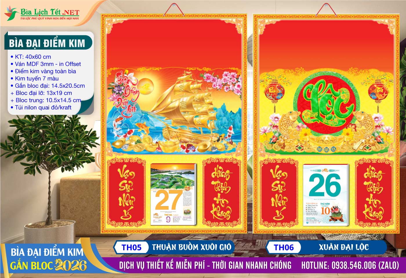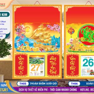 Công Ty Lịch Tết Sài Gòn giới thiệu Bìa Đại (40x60cm) Điểm Kim – Thuận Buồm Xuôi Gió cùng nhiều mẫu mã được ưa chuộng như Phúc Lộc Thọ, Di Lặc, Mai Vàng, chữ Lộc, chữ Phúc, …, tất cả đều mang ý nghĩa chúc năm mới 2026 nhiều may mắn, tài lộc.