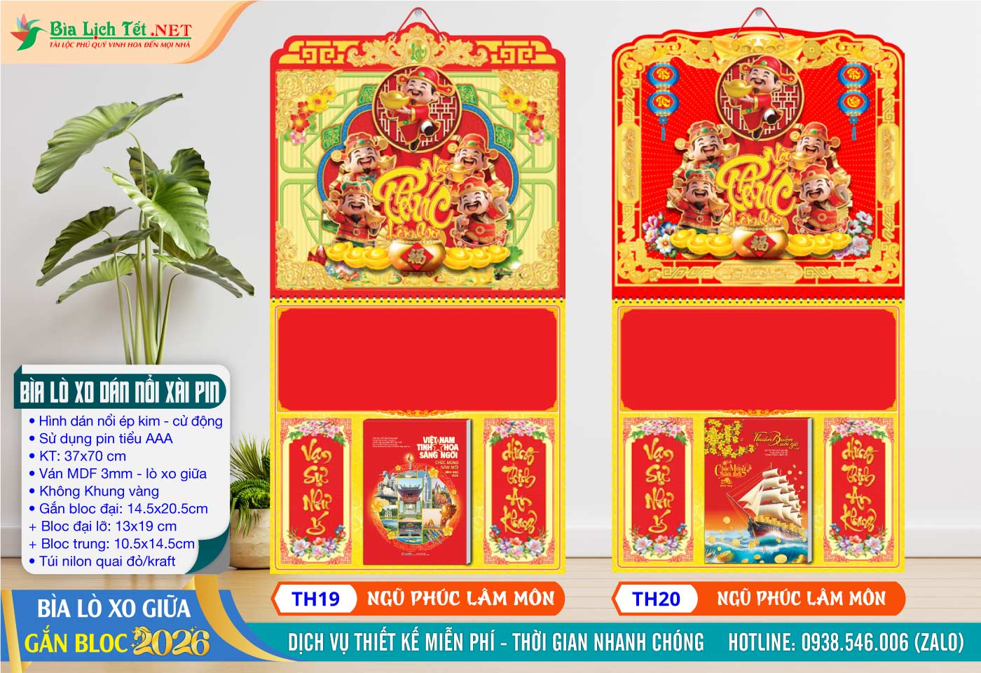 Công Ty Lịch Tết Sài Gòn phân phối Bìa Lò Xo Giữa (37×70) Dán Nổi với nhiều mẫu mã được ưa chuộng như Phúc Lộc Thọ, Di Lặc, Mai Vàng, chữ Lộc, chữ Phúc, Thuận Buồm Xuôi Gió …. . Bìa Lò Xo Giữa Dán Nổi Xài Pin – Ngũ Phúc Lâm Môn sẽ là một chọn lựa để quý doanh nghiệp, đại lý gas, tiệm vàng dùng làm quà tặng khách hàng trong dịp xuân này.