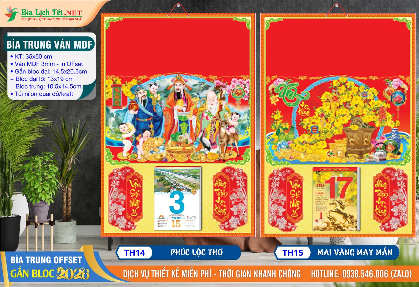 Công Ty Lịch Tết Sài Gòn phân phối Bìa Trung Carton Gắn Bloc (35×50) dịp xuân Bính Ngọ với nhiều mẫu mã được ưa chuộng như Phúc Lộc Thọ, Di Lặc, Mai Vàng, chữ Lộc, chữ Phúc. Bìa Trung (35×50) – Phước Lộc Thọ sẽ là một chọn lựa với chi phí thấp nhưng hiệu quả rất cao để quý doanh nghiệp, đại lý gas, tiệm vàng dùng làm quà tặng khách hàng trong dịp xuân Bính Ngọ này. Bìa trung (35×50) gắn bloc 2026 là loại bìa có giá thành thấp nhất, bìa Carton & Ván MDF in Offset 5 màu cao cấp.