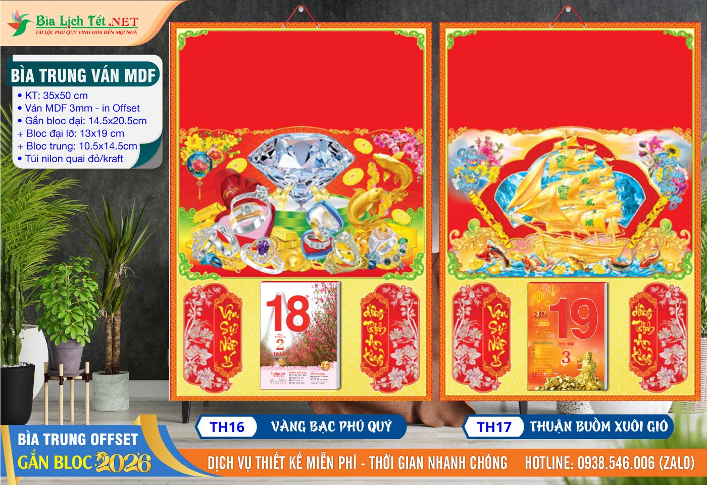 Công Ty Lịch Tết Sài Gòn phân phối Bìa Trung Carton Gắn Bloc (35×50) dịp xuân Bính Ngọ với nhiều mẫu mã được ưa chuộng như Phúc Lộc Thọ, Di Lặc, Mai Vàng, chữ Lộc, chữ Phúc. Bìa Trung 35×50 – Vàng Bạc Phú Quý sẽ là một chọn lựa với chi phí thấp nhưng hiệu quả rất cao để quý doanh nghiệp, đại lý gas, tiệm vàng dùng làm quà tặng khách hàng trong dịp xuân Bính Ngọ này. Bìa trung (35×50) gắn bloc 2026 là loại bìa có giá thành thấp nhất, bìa Carton & Ván MDF in Offset 5 màu cao cấp.
