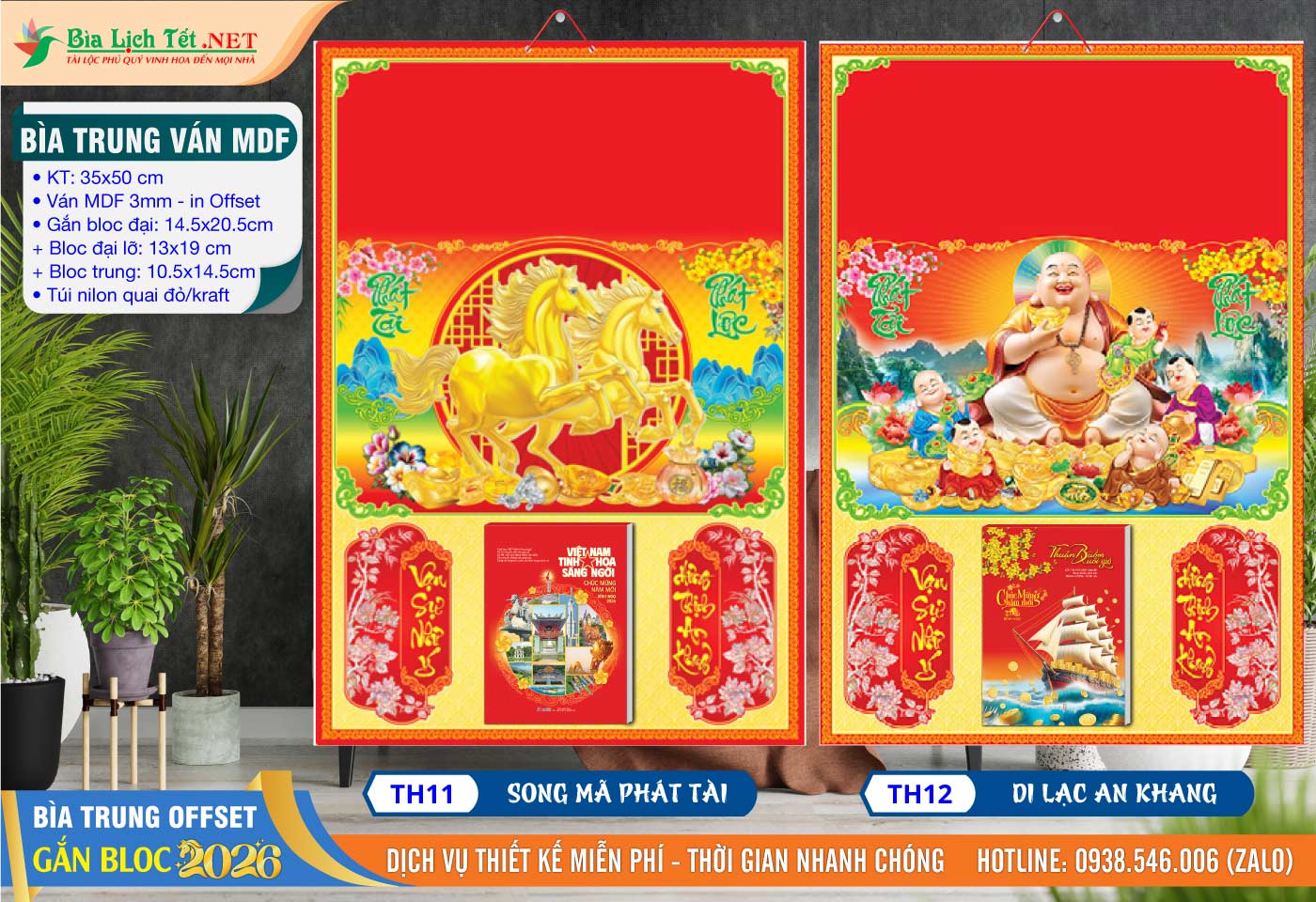 Công Ty Lịch Tết Sài Gòn phân phối Bìa Trung Carton Gắn Bloc (35×50) dịp xuân Bính Ngọ với nhiều mẫu mã được ưa chuộng như Phúc Lộc Thọ, Di Lặc, Mai Vàng, chữ Lộc, chữ Phúc. Bìa Trung 35×50 – Song Mã Phát Tài sẽ là một chọn lựa với chi phí thấp nhưng hiệu quả rất cao để quý doanh nghiệp, đại lý gas, tiệm vàng dùng làm quà tặng khách hàng trong dịp xuân Bính Ngọ này. Bìa trung (35×50) gắn bloc 2026 là loại bìa có giá thành thấp nhất, bìa Carton & Ván MDF in Offset 5 màu cao cấp.
