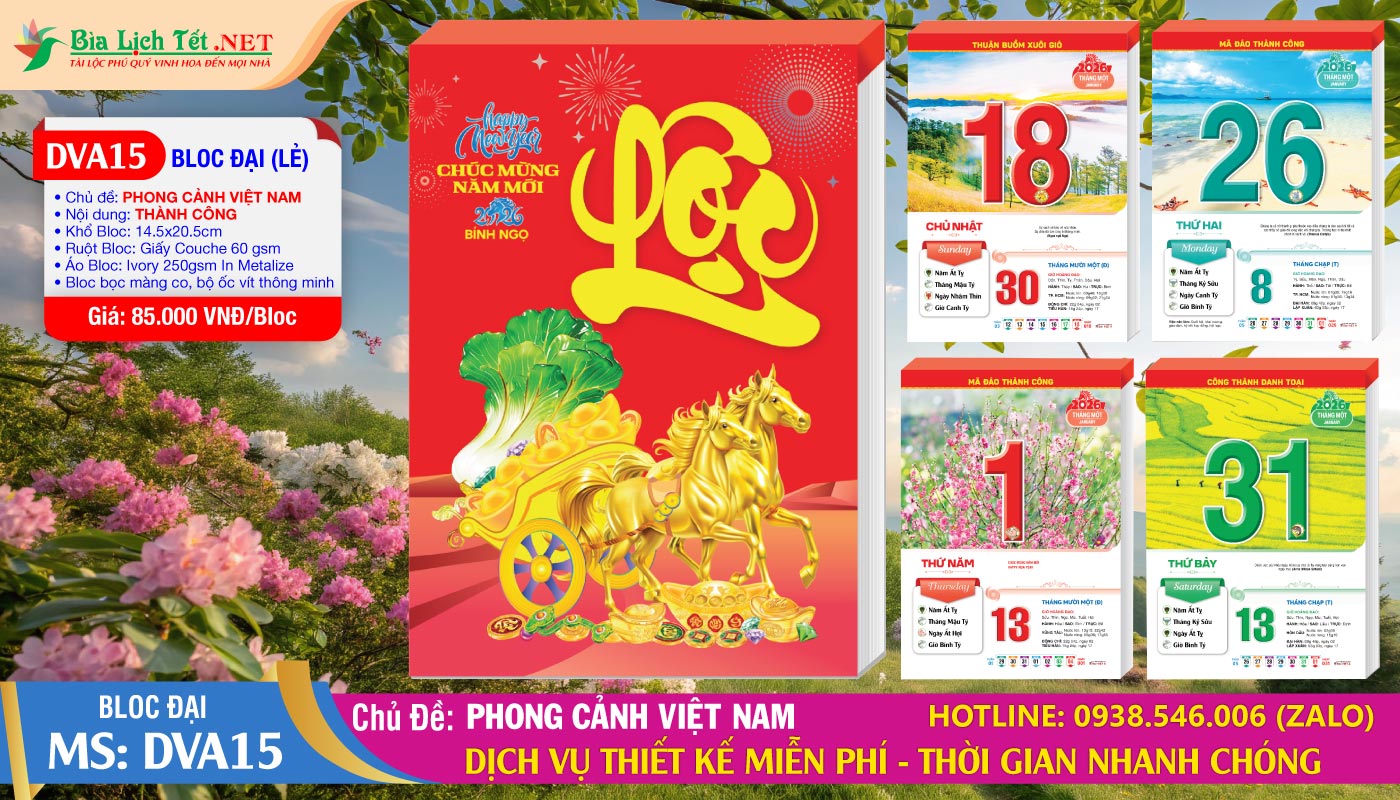 – Bloc đại 14.5×20.5 gắn được bìa lịch đại 40×60, bìa đại lỡ 34x60cm, bìa lò xo giữa 37x70cm